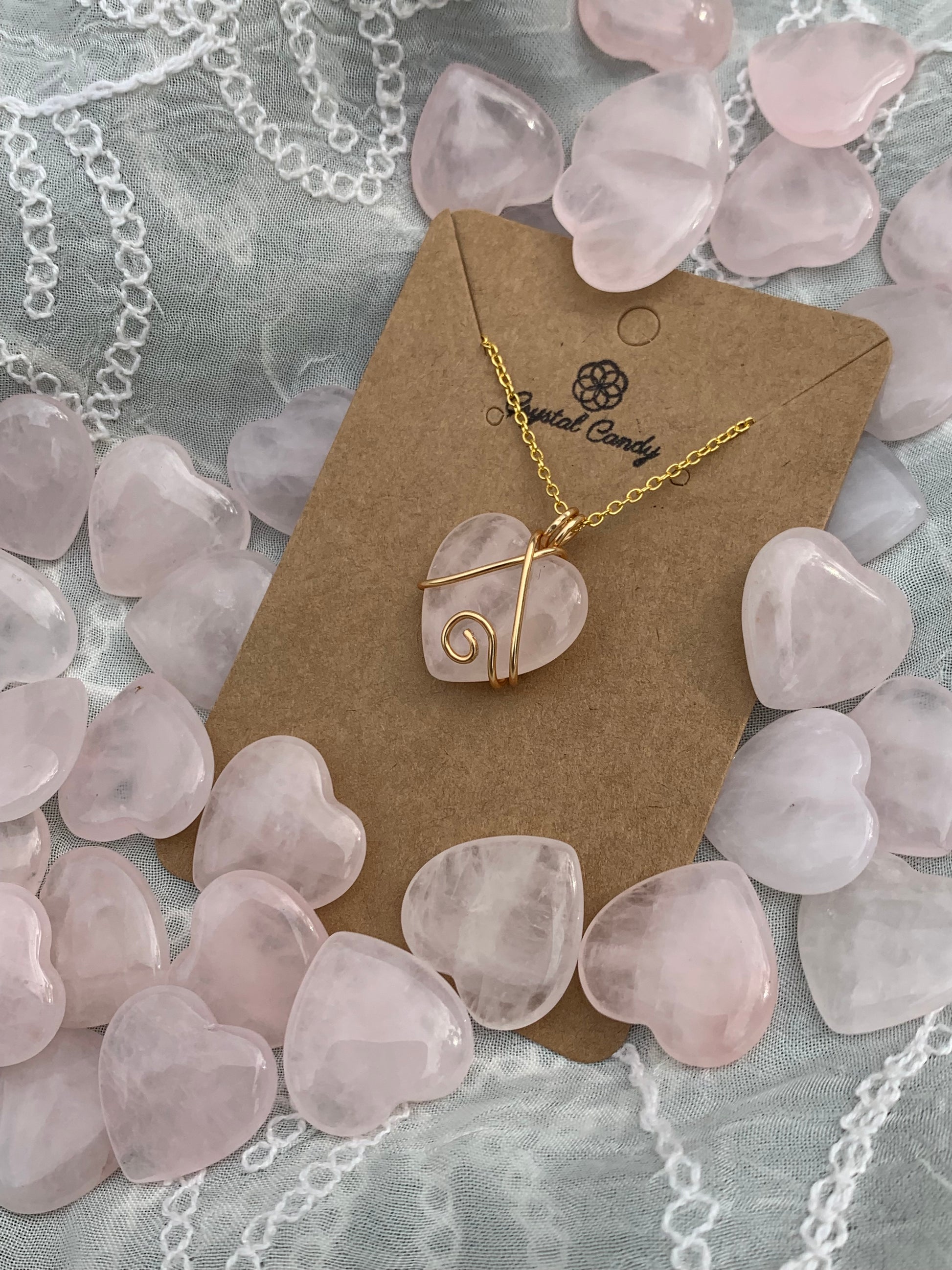 handmade wire wrapped rose quarts heart shaped carving with swirly detail.