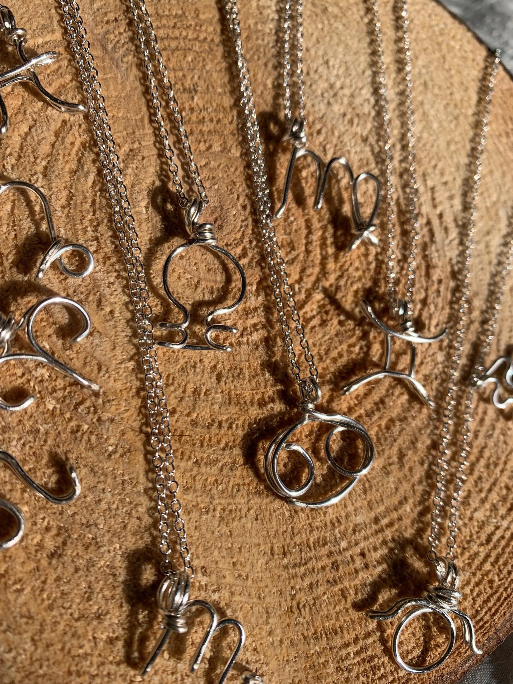 all completely handmade with wire to represent the 12 zodiac symbols: Aries, Taurus, Gemini, Cancer, Leo, Virgo, Libra, Scorpio, Sagittarius, Capricorn, Aquarius, and Pisces.