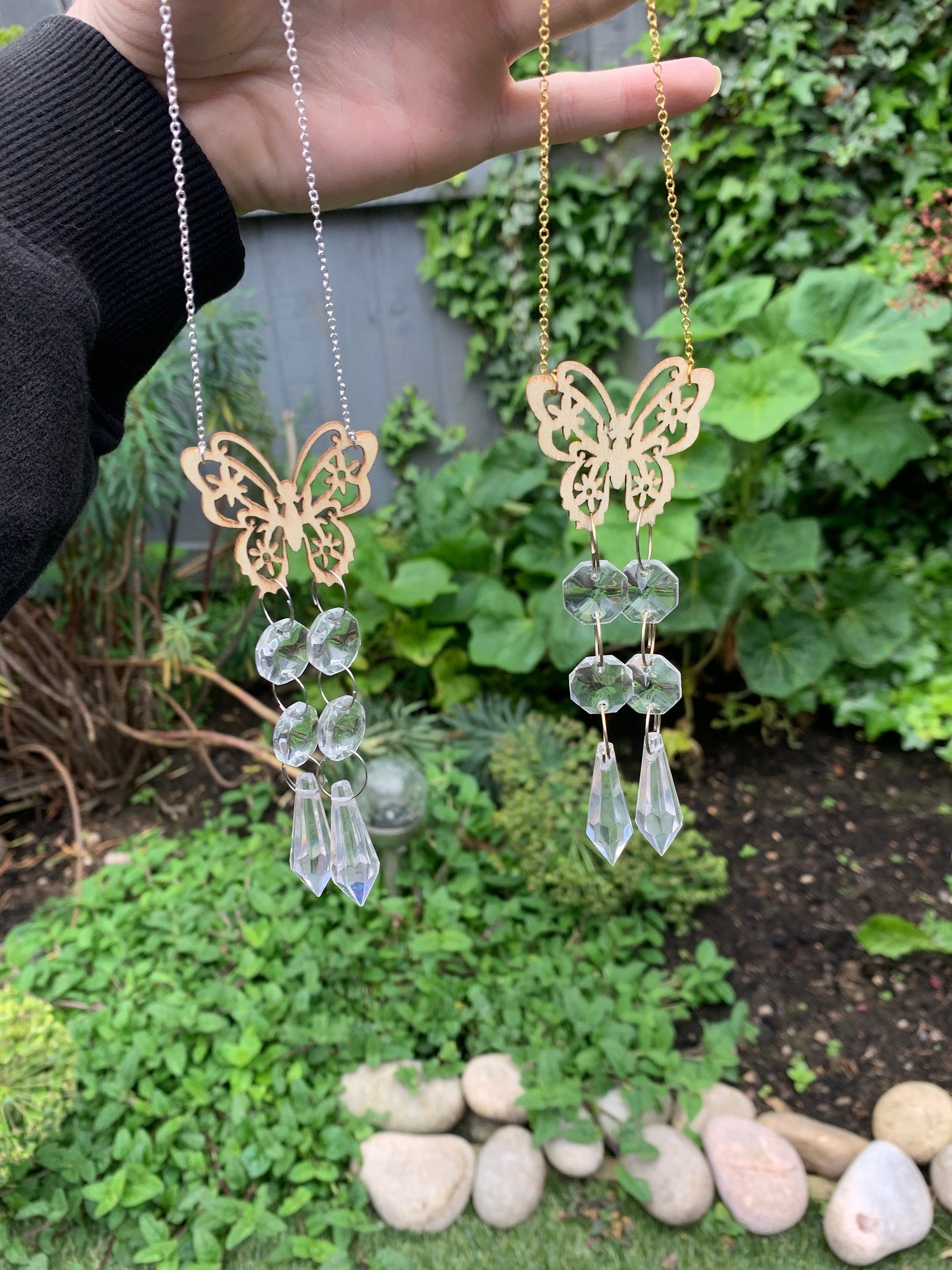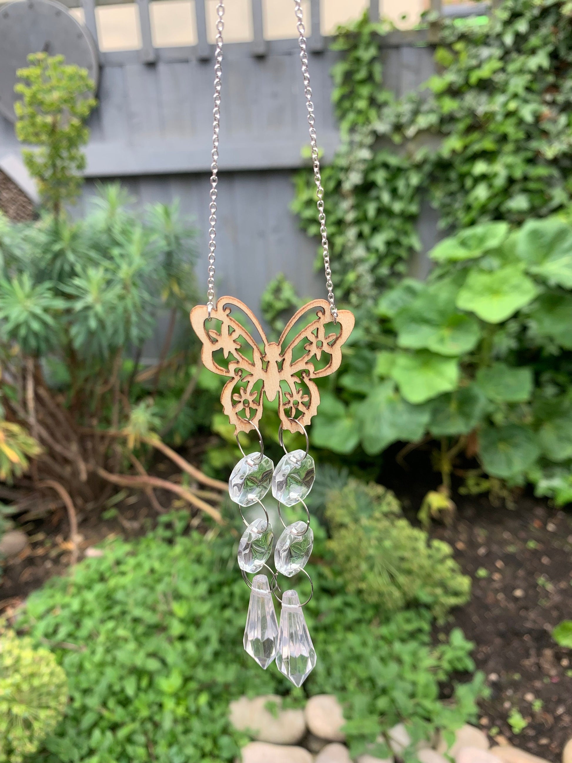 handmade using natural wooden butterflies and tarnish resistant chains and wire.