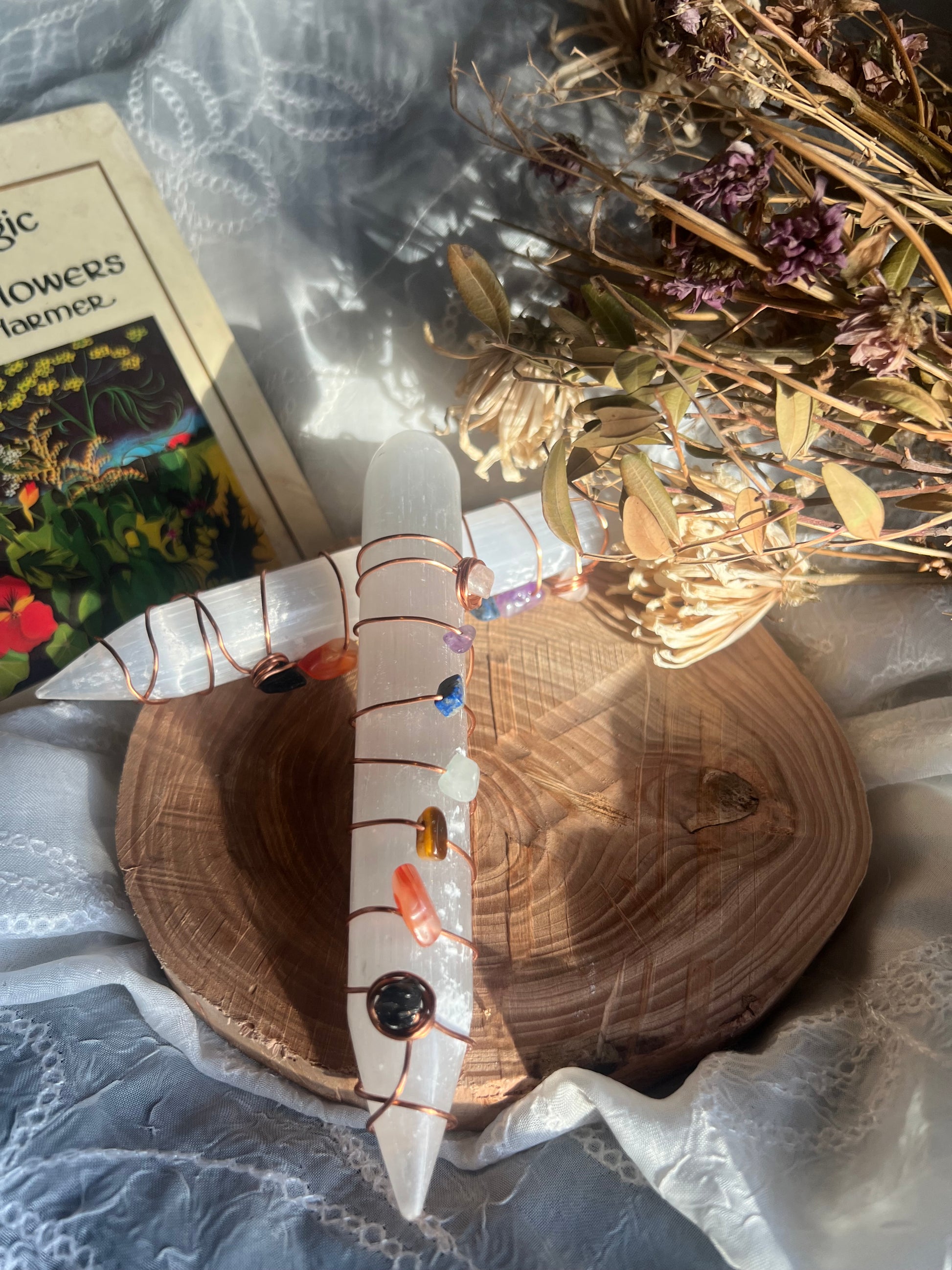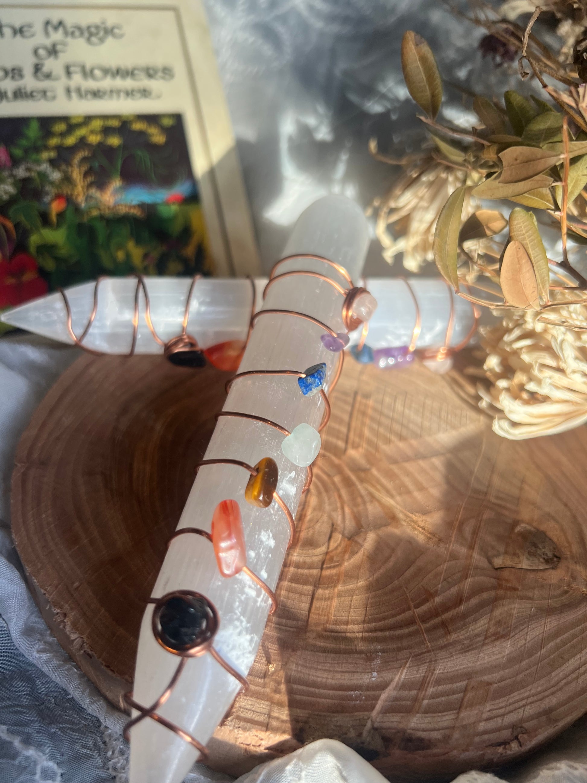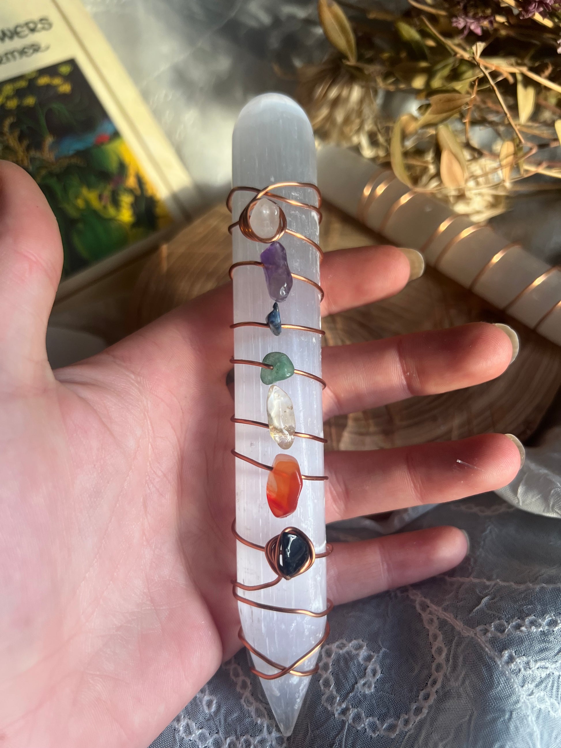 handmade wire wrapped satin spar slenite wand wrapped in copper wire.