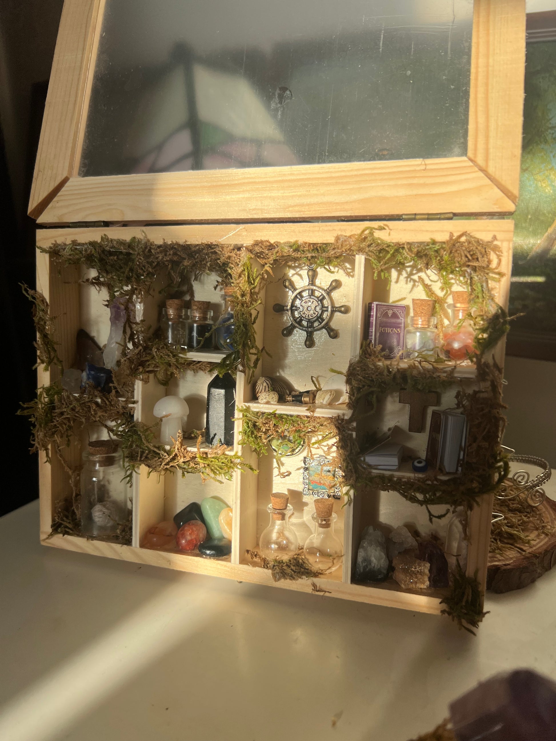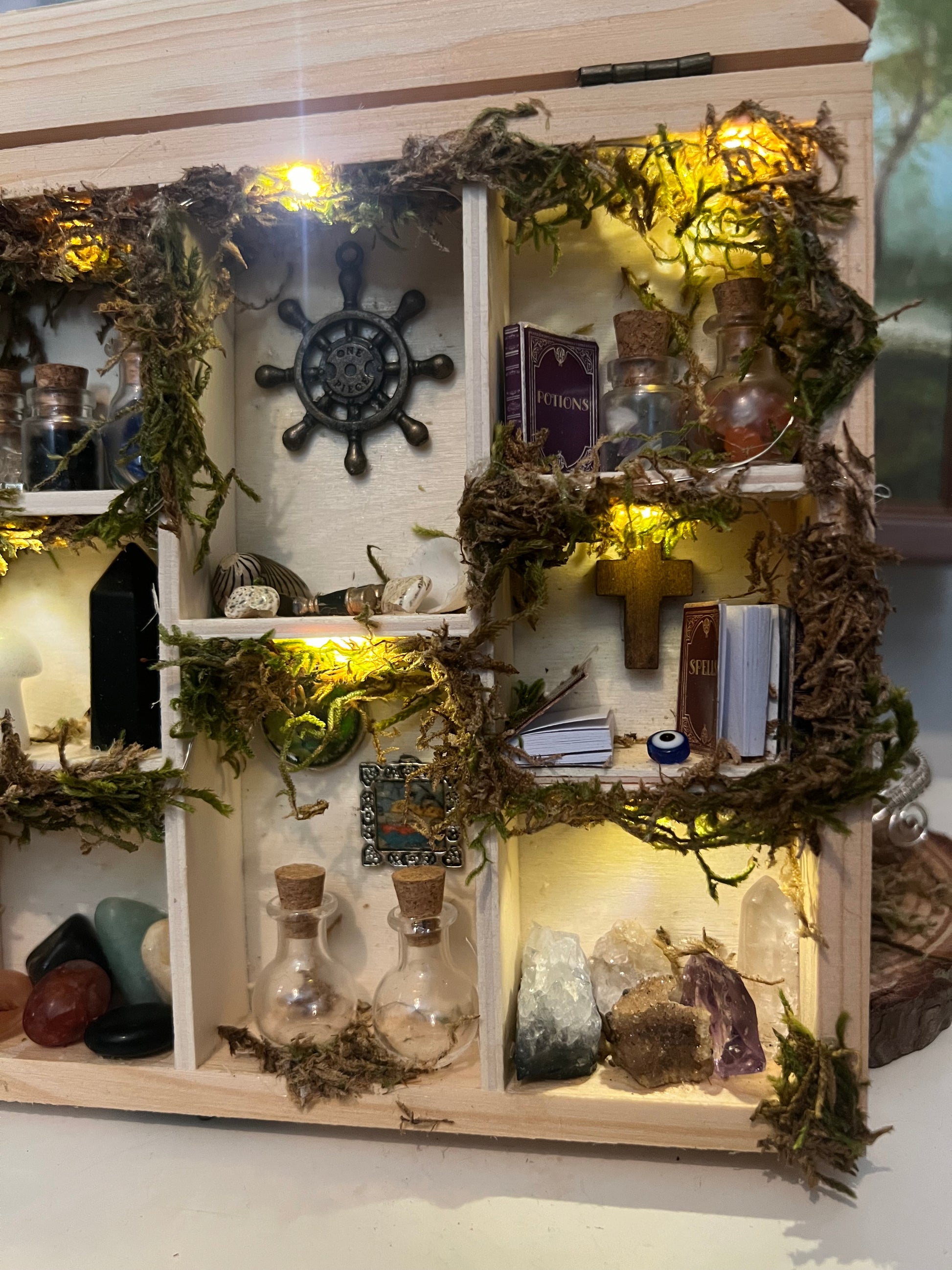 (includes shells, crystals, mini charms, mini glass bottles, mushrooms, books, papers ect)