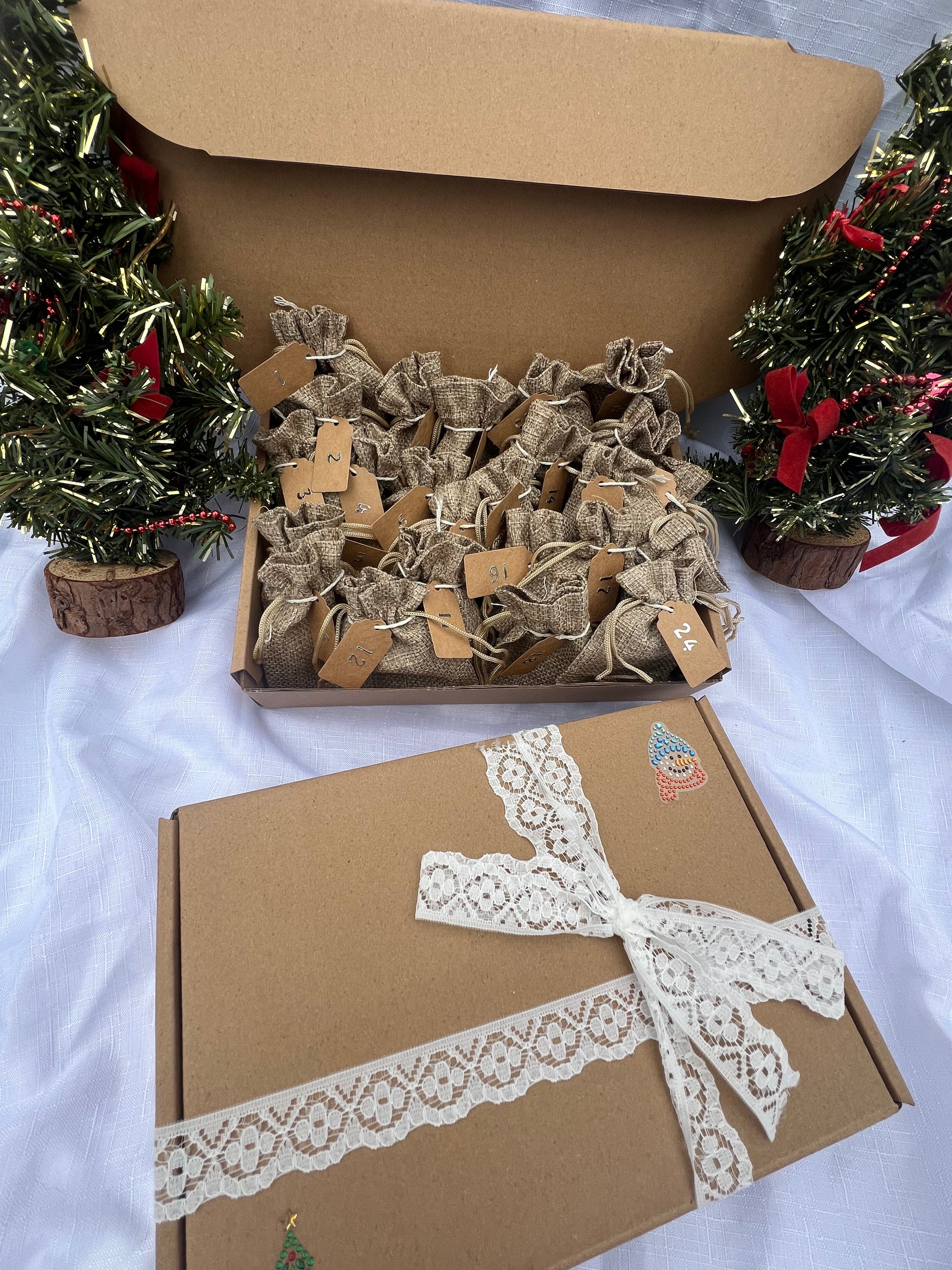 includes 24 unique tumble stones, one for each day, and a little card explaining what each stone is. plus a bonus gift for Christmas day.