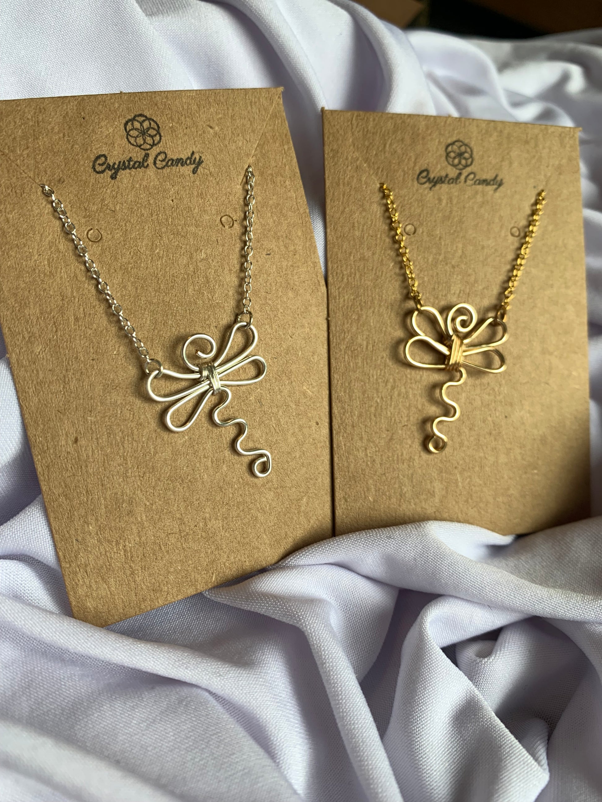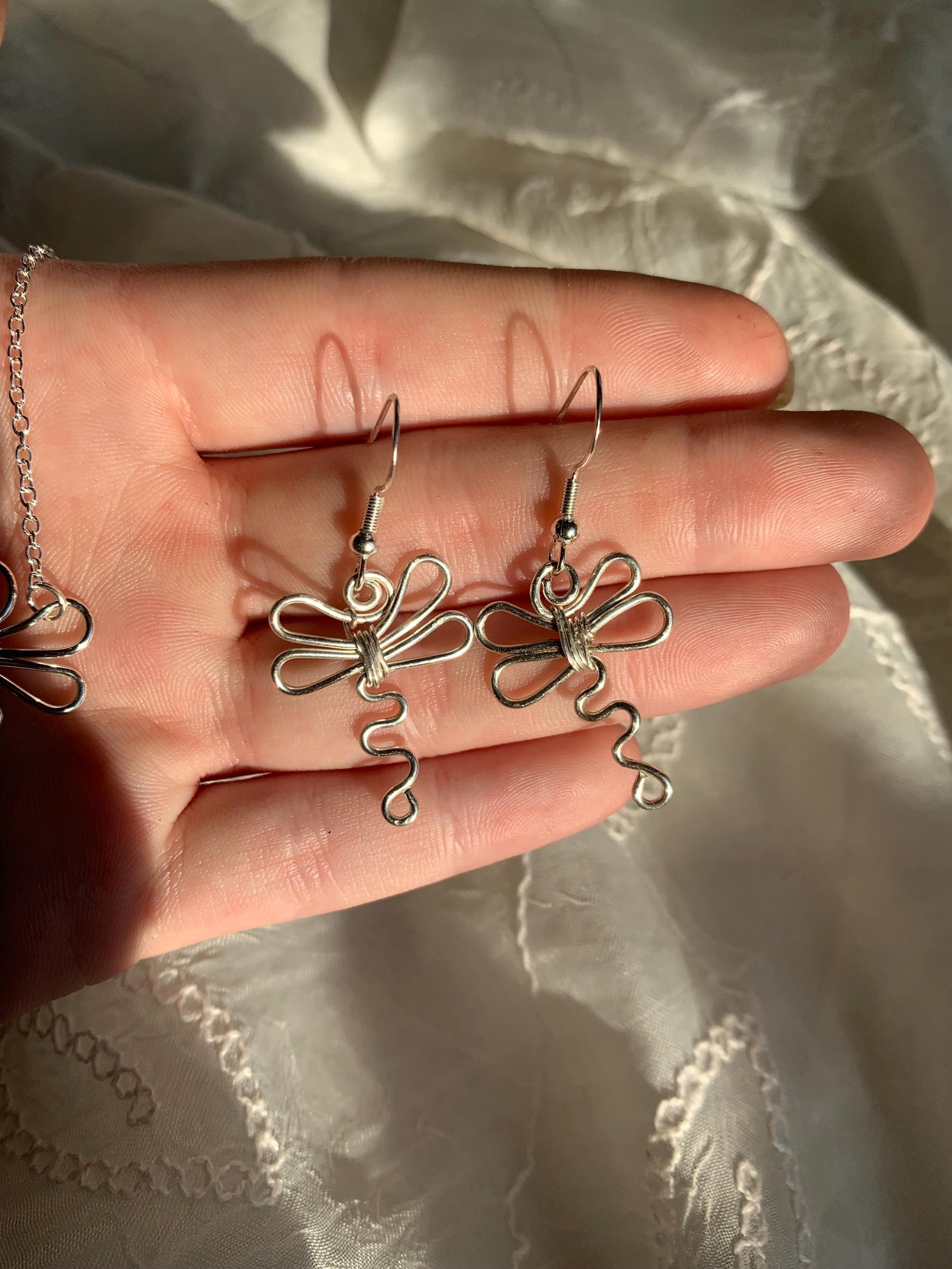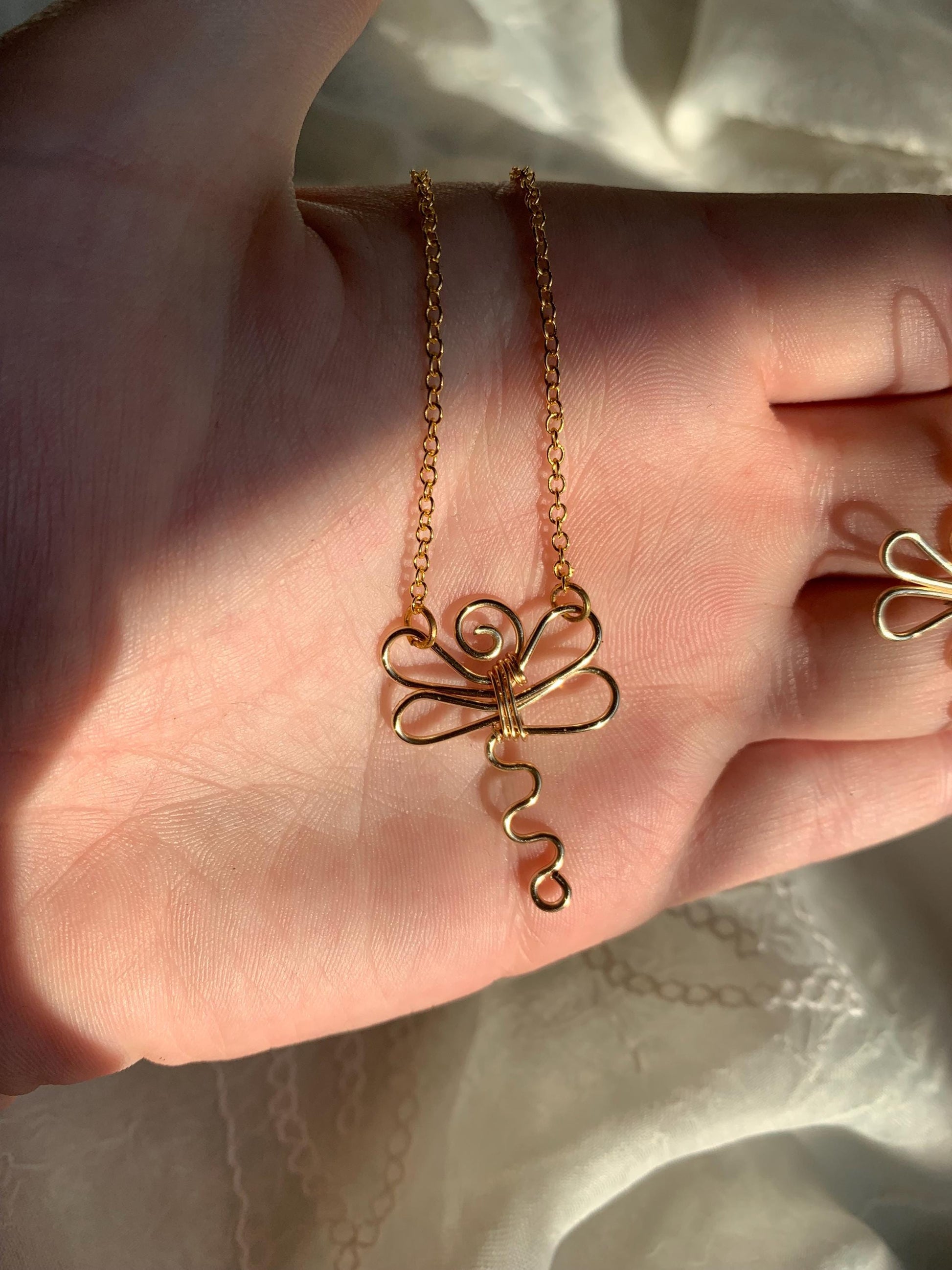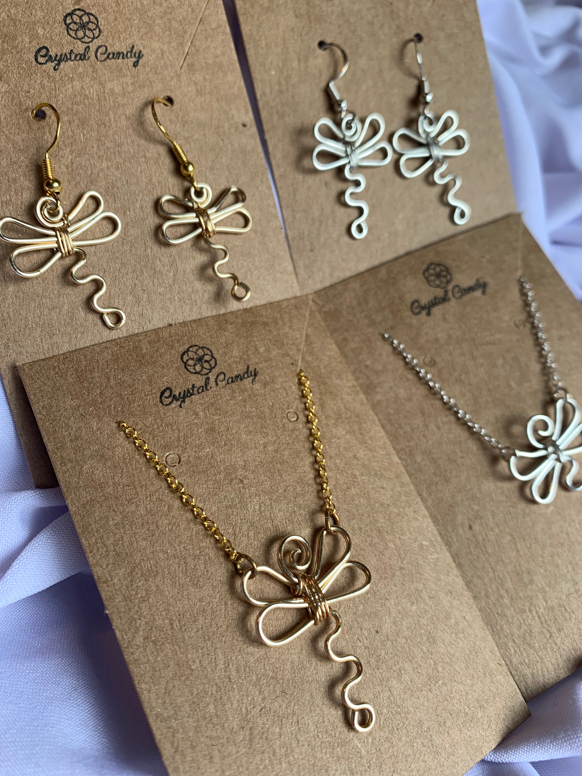 handmade wire wrapped dragon fly symbol of change, transformation, and self-realization nekclace and earrings.