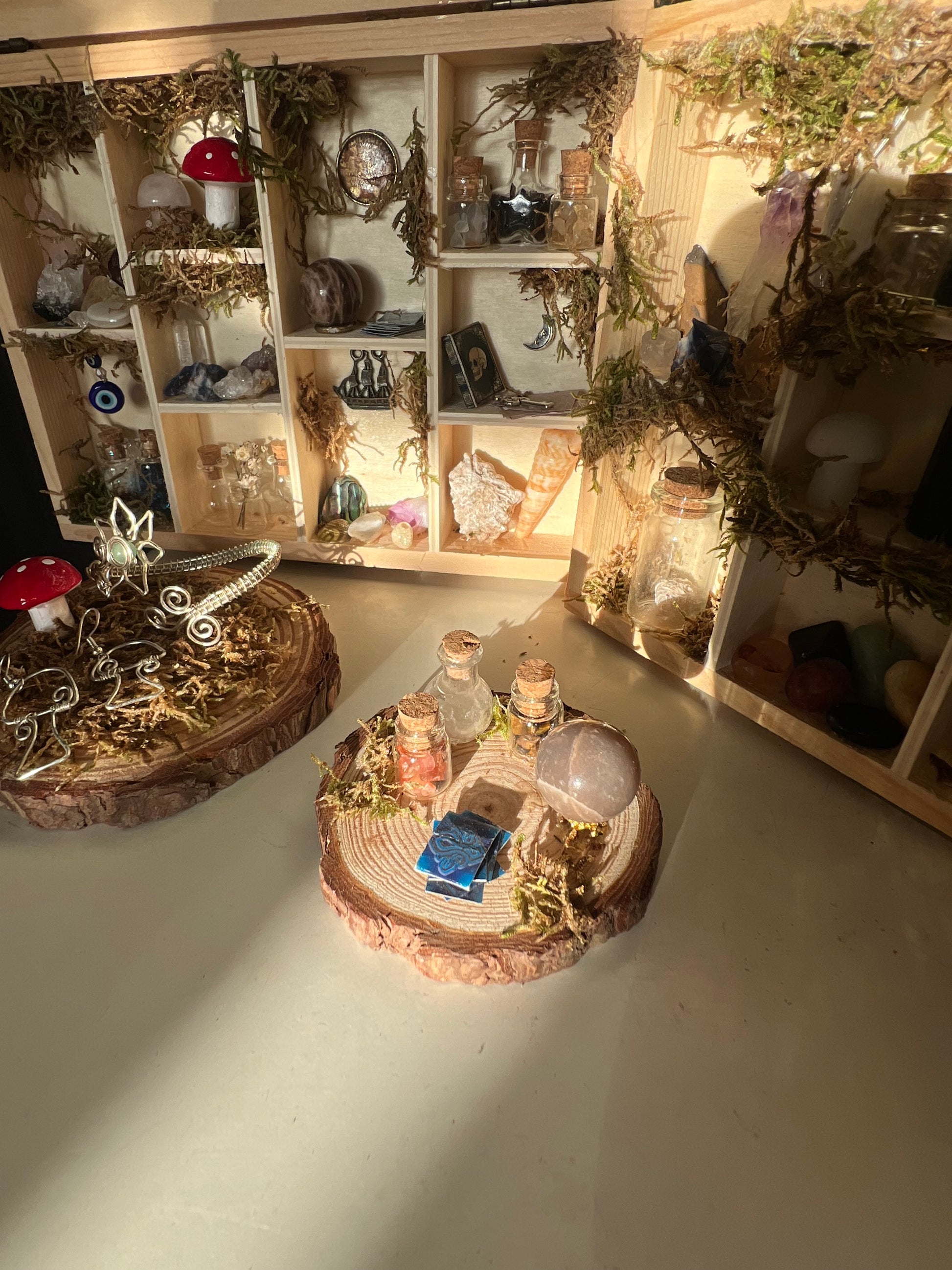handmade with mini tarot deck, mini natural crystal ball, and mini potion bottles.