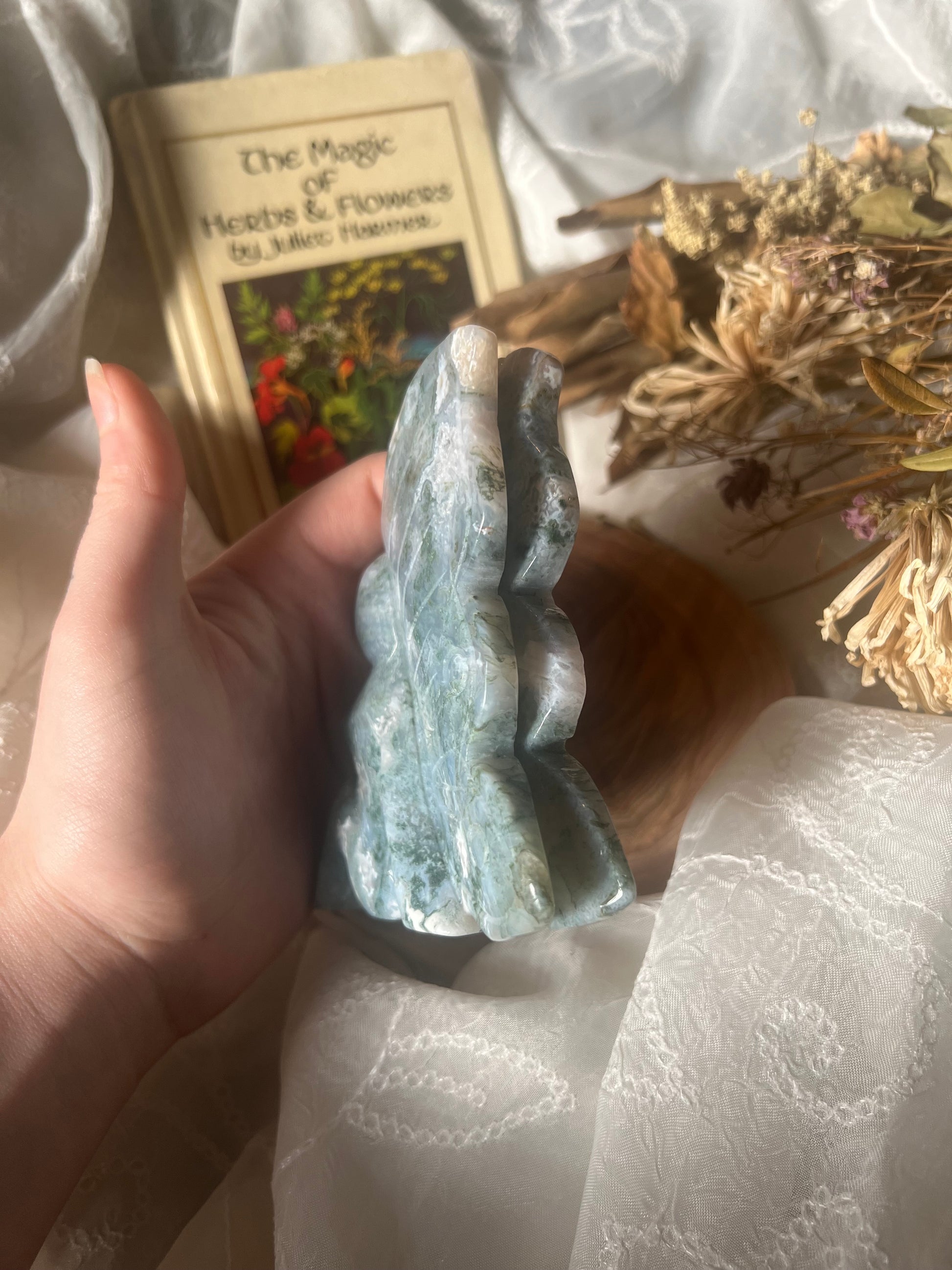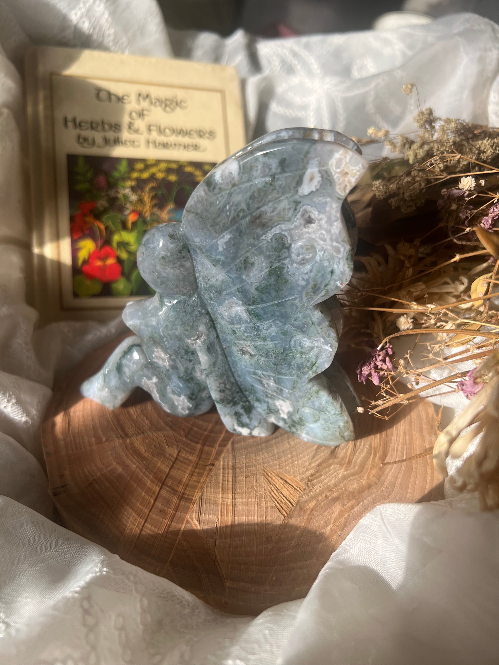 x-large moss agate sitting fairy display carving.